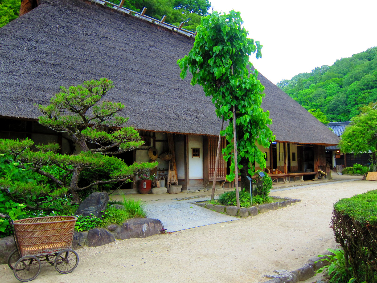 The museum features reconstructed thatched-roof buildings, including a main house, gatehouse, and workshops, providing an authentic setting that reflects the historical mountain village atmosphere.